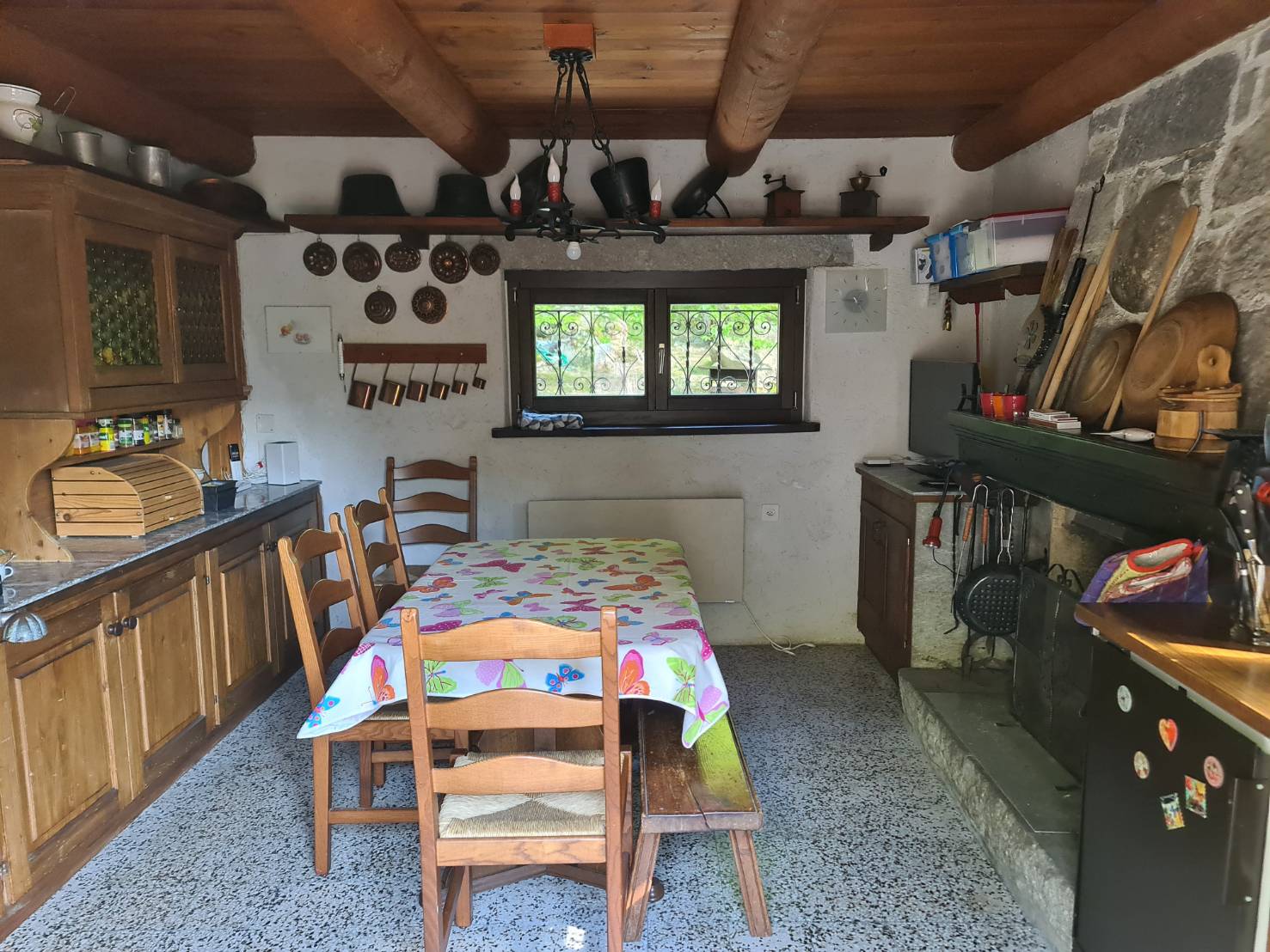 In der Küche können Sie das wunderschöne Cheminée geniessen, genügend Brennholz finden Sie im Garten.